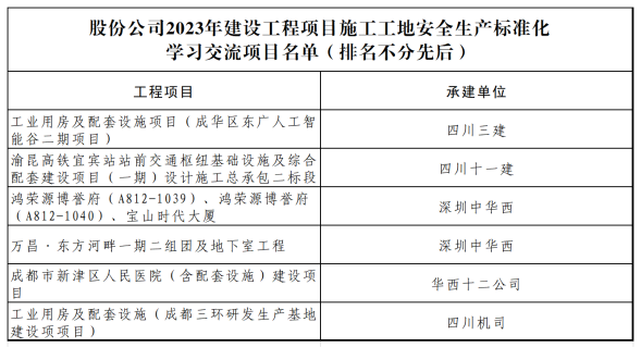 奋战四个月,再添捷报!近日,中国建筑行业“安全文明施工”最高荣誉——“2023年建设工程项目施工工地安全生产标准化学习交流项目”揭晓,股份公司6个项目榜上有名,数量位居四川前列。其中,深圳中bevictor伟德斩获2项,四川三建、四川十一建、bevictor伟德十二公司、四川机司分别获得1项,获奖名单如下: